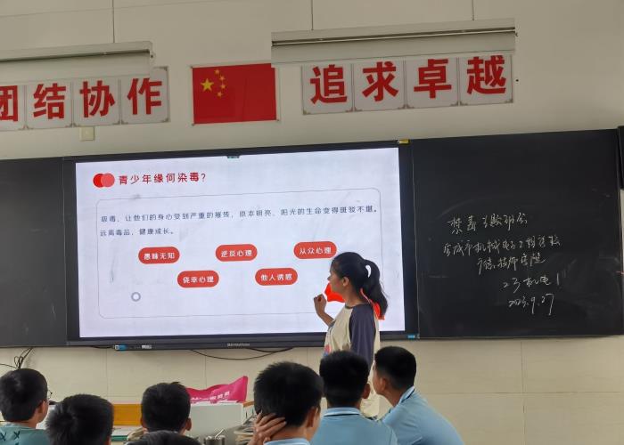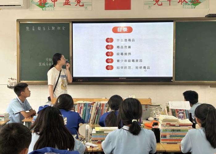班会课上,班主任运用真实案例的方式对学生进行禁毒教育,让学生们认识了什么是毒品、毒品的危害、分析青少年吸毒的原因,如何防范拒绝毒品,使大家从中深深地感受到毒品的可怕。之后通过阅读相关的法律条例、禁毒知识问答等方式,使学生全面认识毒品的危害,学会抵制诱惑,自觉远离毒品。